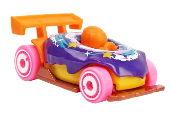 Als Donut mit großem Heckflügel und zentraler Fahrerposition entworfen, greift das Modell das Food‑Car‑Thema von Hot Wheels voll auf und kombiniert verspielte Fantasie mit einer tiefen, rennfertigen Haltung.