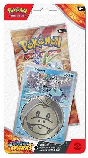 Ignite your collection with the Surging Sparks Checklane Blister Pack from the Scarlet & Violet series. This compact booster product offers a burst of content featuring cards, promos, and a collectible item in one accessible package.