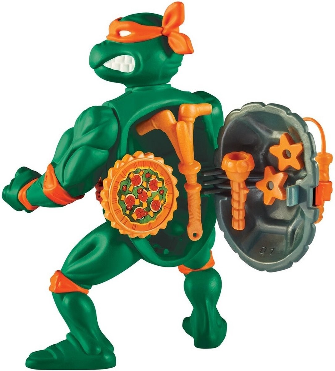 His back shell opens up to reveal hidden storage space, letting you tuck his weapons and gear neatly inside, just like the original storage-shell figures from the early ’90s toy line.
