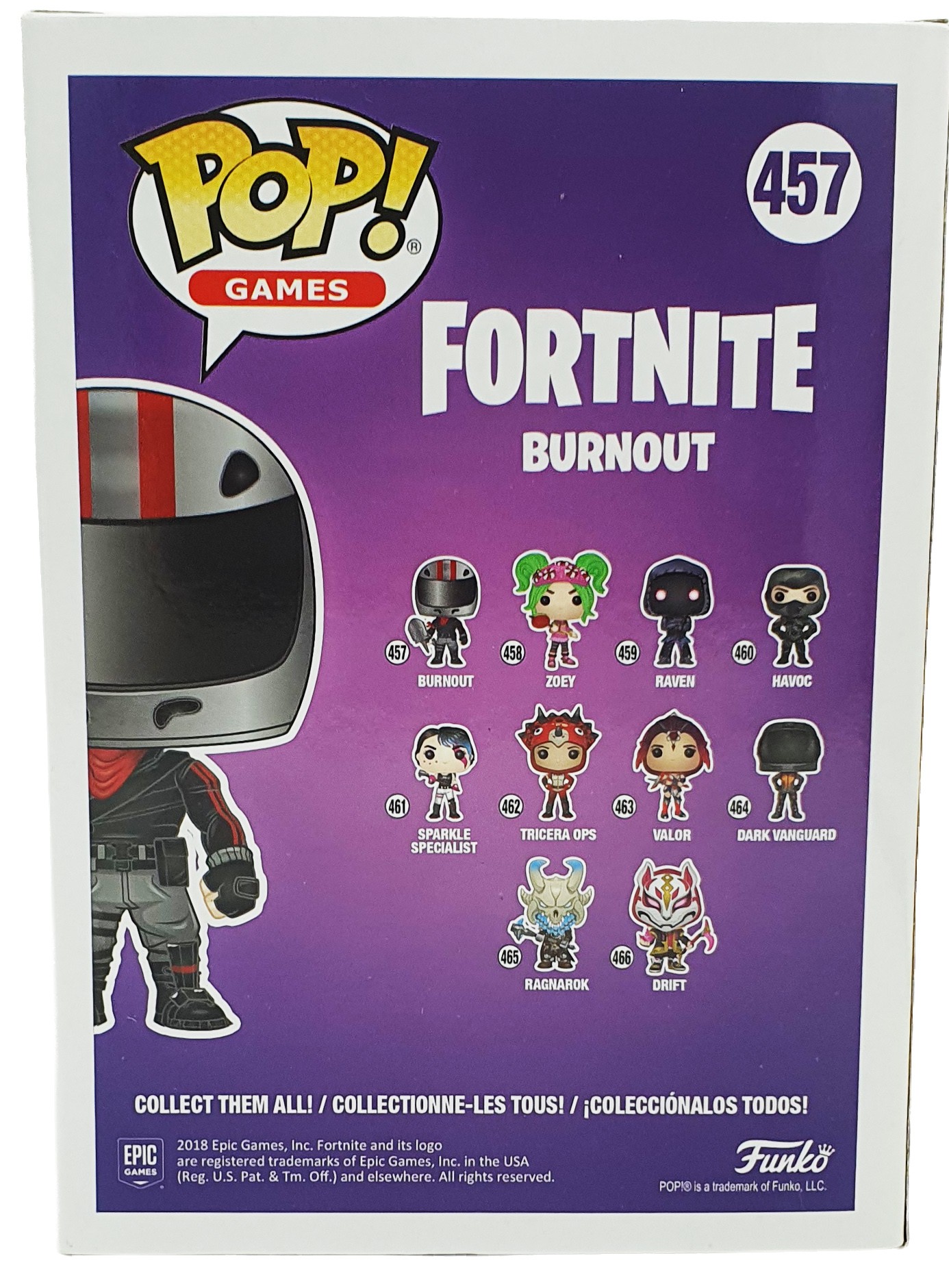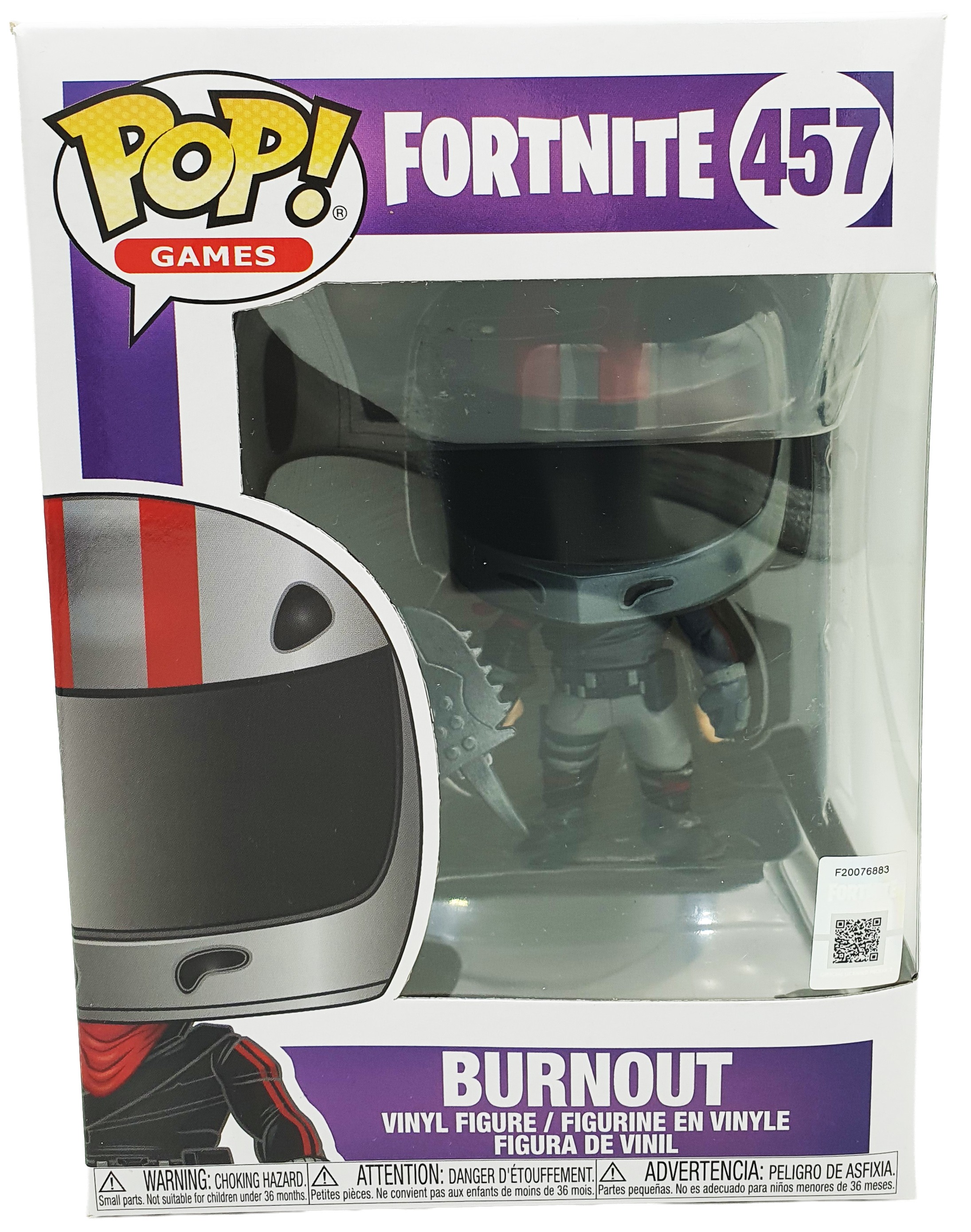 Burnout (457) was first released in late 2019 as part of the POP Games Fortnite Series 2 lineup, with multiple collector listings confirming a 2019 release date and Series 2 classification.