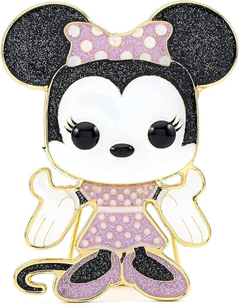 - Large 4-inch metal and enamel Pop-style Minnie character pin