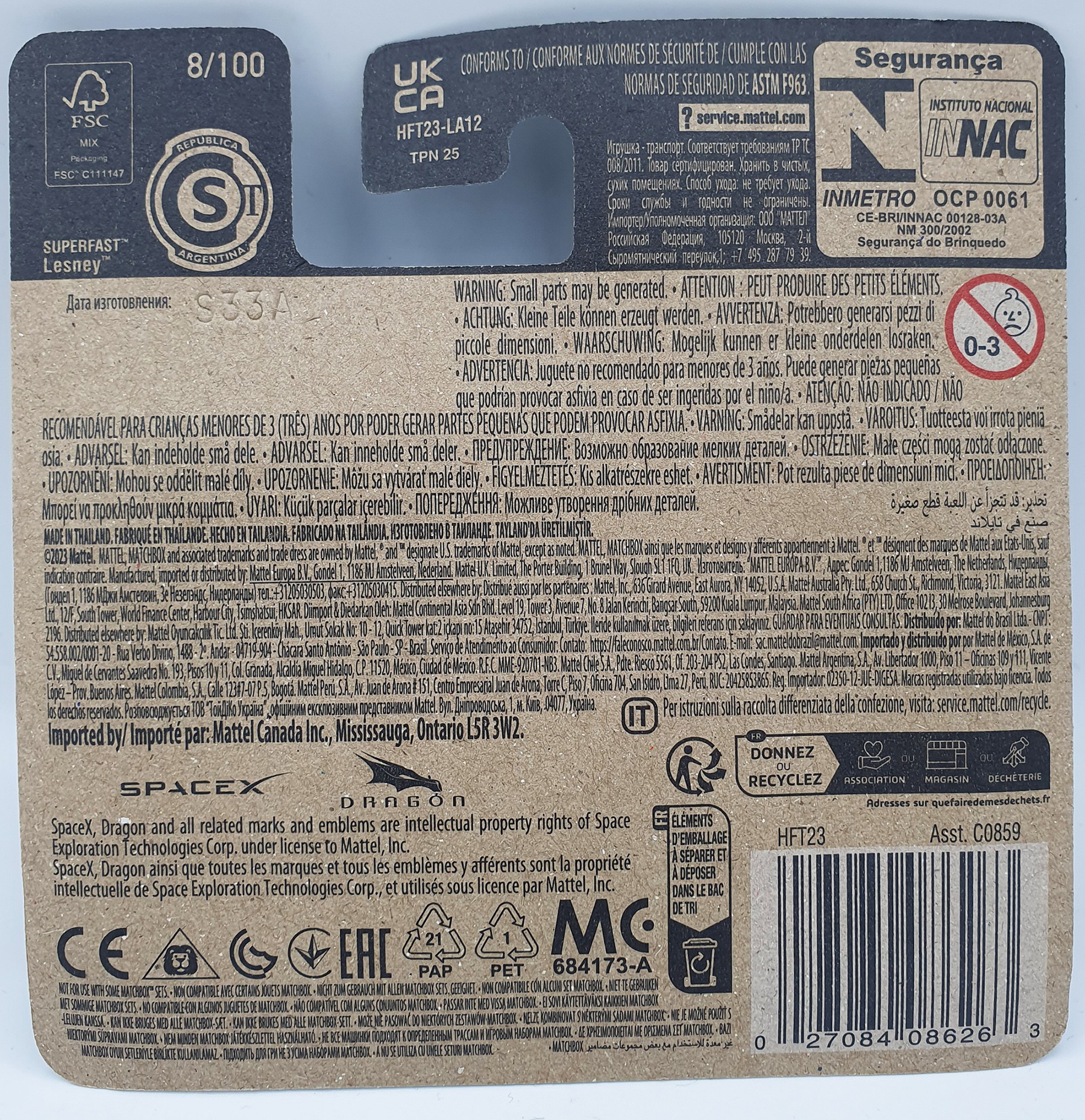 The Matchbox SpaceX Dragon (HFT23-LA12) is a 1:64 scale spacecraft release based on the real SpaceX Dragon capsule, presented here in the Matchbox 70 Years range. The correct release year for this specific retail issue is 2023. Although the model is associated with the 2022 1–100 lineup, collector references identify this HFT23 version as a delayed release that actually reached retail in 2023, making 2023 the correct year for this packaged issue.