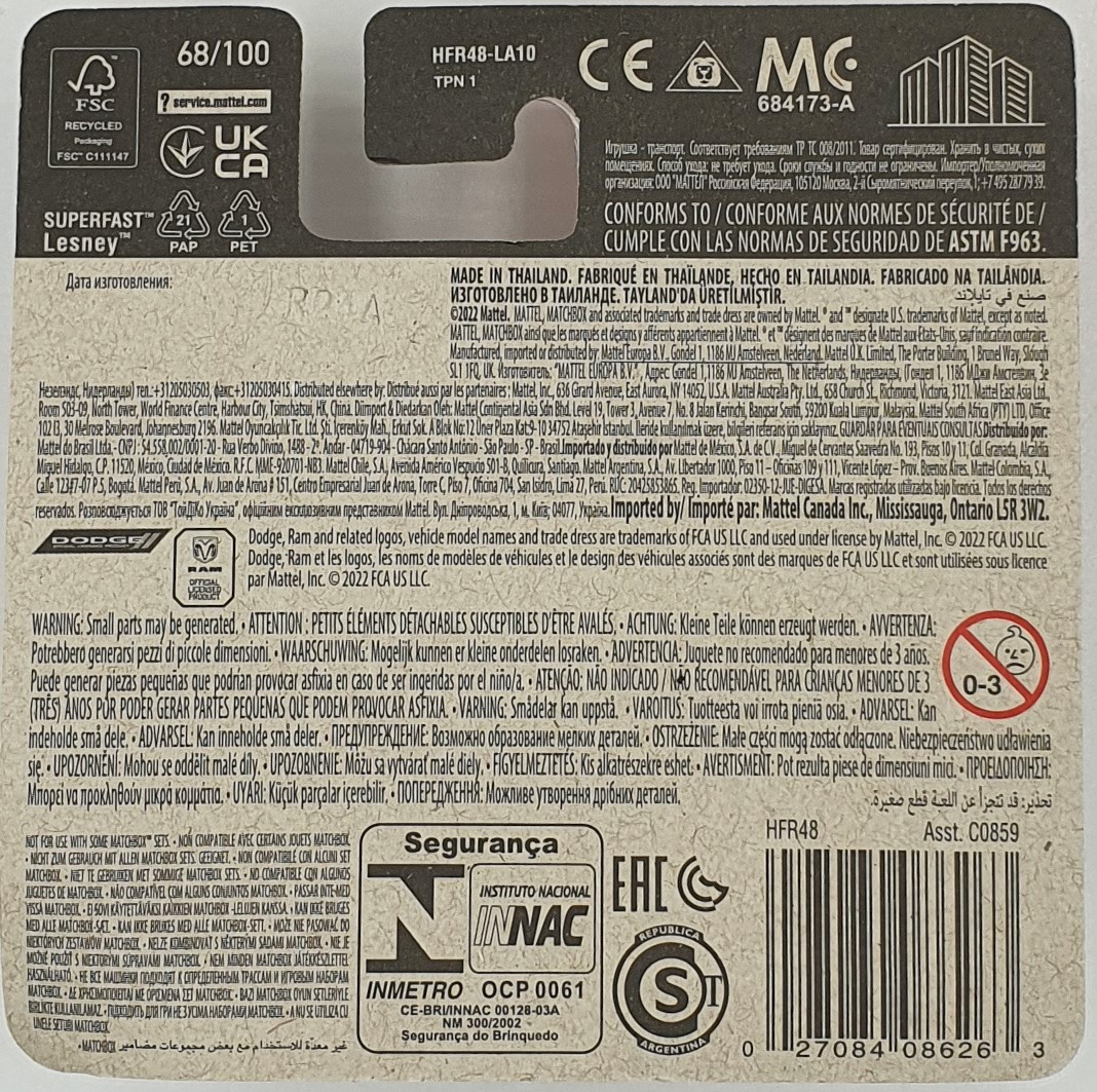 Collector and retail references identify HFR48 as the 2022 Matchbox Dodge Sweptside Pickup, issued as 68/100 in the mainline assortment.