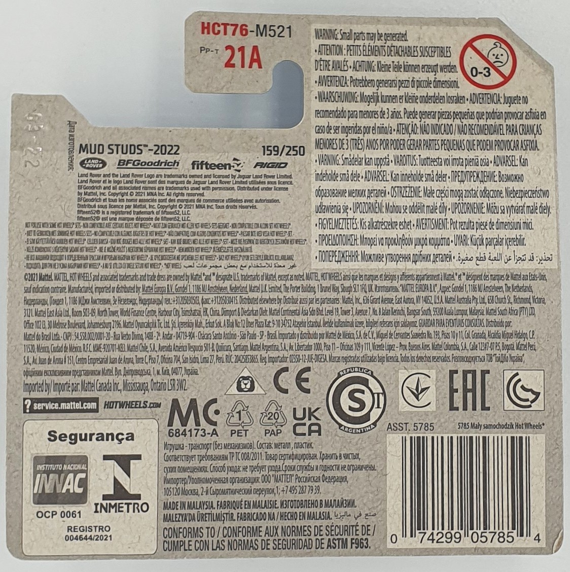 Collector references identify HCT76 as the 2022 Hot Wheels release of the Range Rover Classic, issued as 159/250 in the mainline and 4/5 in the Mud Studs series.