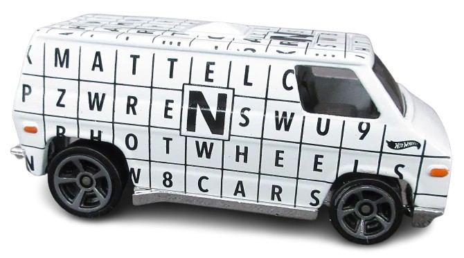 - White custom van with bold black letter-grid artwork and retro styling