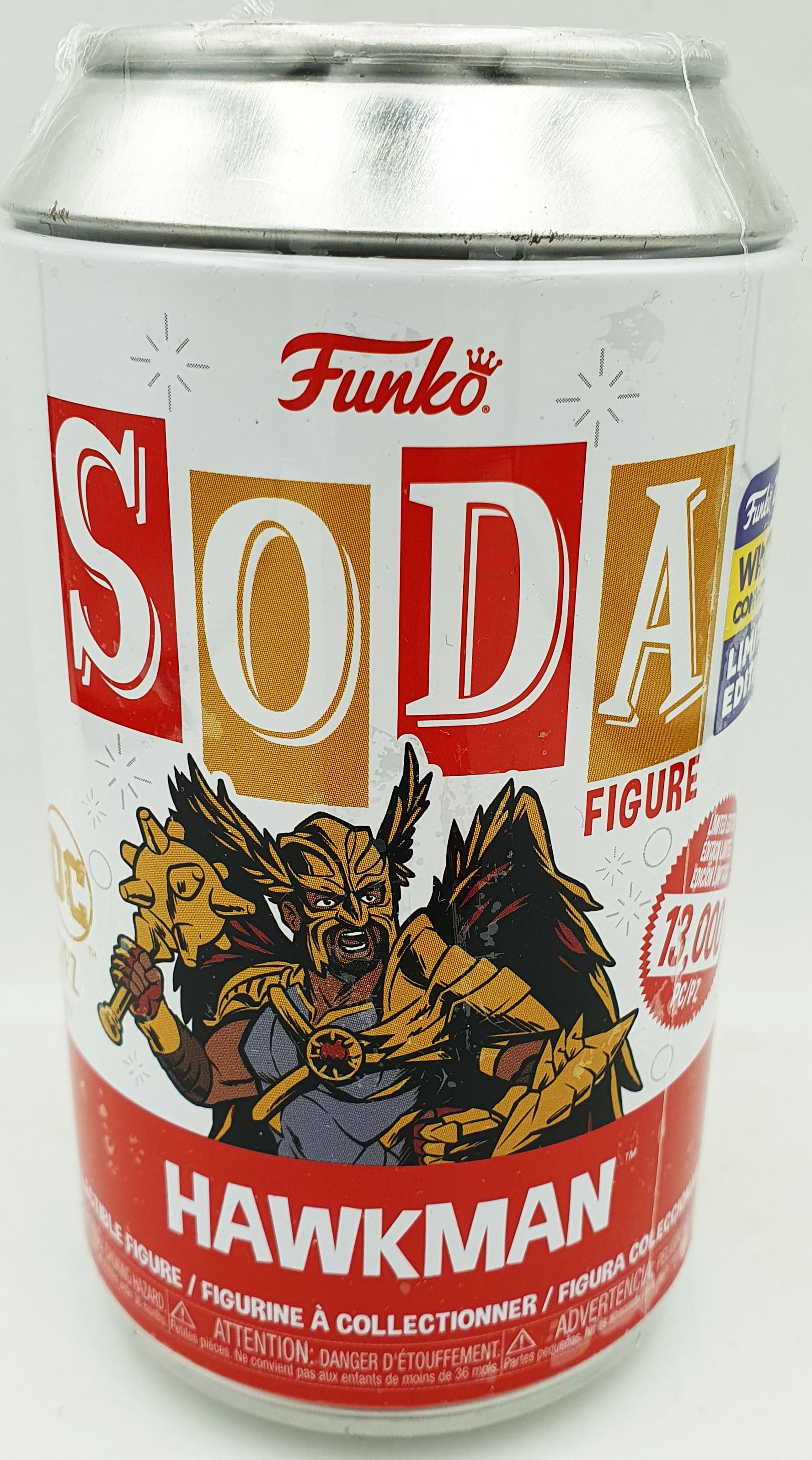Hawkman est scellé dans une canette rétro ornée d’un visuel dynamique du personnage et d’un autocollant officiel de la Winter Convention 2022 pour renforcer sa valeur de collection.
