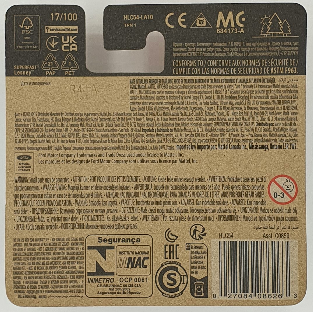 Les références commerciales et de collection identifient HLC54 comme la Matchbox 1970 Ford Ranchero 2023, sortie en tant que 17/100 dans l’assortiment mainline.