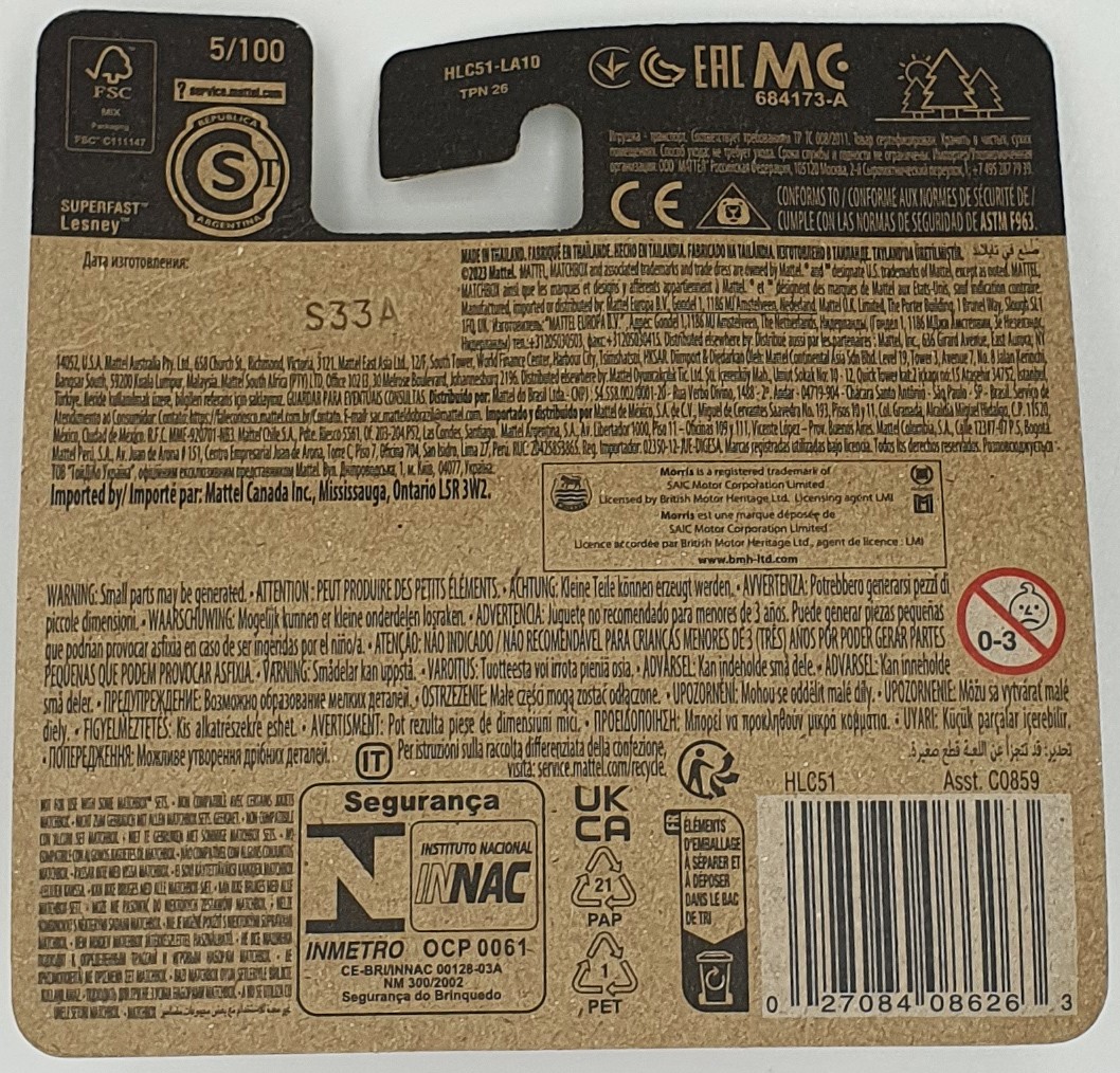 Les références de collectionneurs et de vente identifient HLC51 comme la Matchbox Morris Minor Saloon 2023, sortie en tant que 5/100 dans l’assortiment mainline.